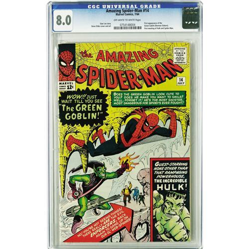 <B>The Amazing Spider-Man #14 (Marvel, 1964) CGC VF 8.0 Off-white to white pages.</B></I> The Green Goblin was already a villain of the highest caliber even before the "Spider-Man" movie came out, and he has only cemented that status since, especially as the second film hinted at a return in the third. So how could you not want a high-grade copy of the Goblin's first appearance? This issue also features the first-ever meeting between the Hulk and Spider-Man. Steve Ditko drew all of the action. Overstreet 2006 VF 8.0 value = $1,461. CGC census 3/06: 49 in 8.0, 147 higher.
