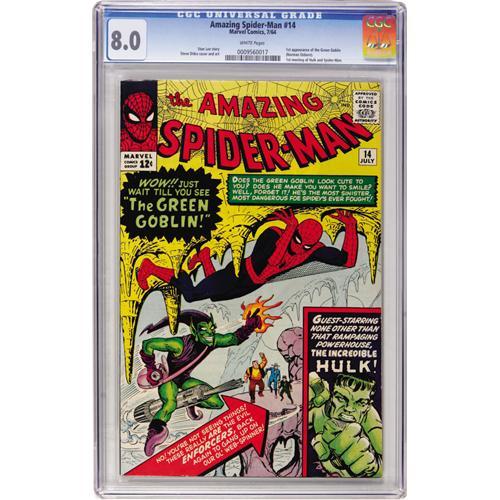 <B>The Amazing Spider-Man #14 (Marvel, 1964) CGC VF 8.0 White pages.</B></I> This power-packed ish features the first appearance of the Green Goblin, as played by Norman Osborn. In addition, Spidey and the Hulk meet for the first time. 'Nuff said, true believers? Cover and interior artwork by Steve Ditko. Overstreet 2006 VF 8.0 value = $1,461. CGC census 3/07: 56 in 8.0, 159 higher. <I> From the Janowicz Collection.</B></I><BR><BR><b>Shipping:</b> Comics - Slabbed (certified) (<a target="_blank" href="http://www.heritageauctions.com/common/shipping.php">view shipping information</a>)