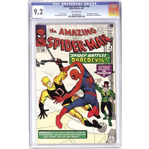 <B>The Amazing Spider-Man #16 (Marvel, 1964) CGC NM- 9.2 Off-white pages.</B></I> This is Daredevil's first crossover appearance, still in his original yellow costume, no less. The Man Without Fear teams with Spider-Man to battle the Ringmaster. The cover and interior art are by Steve Ditko. <I>Betcha didn't know:</B></I> This was DD's <I>only</B></I> crossover appearance ever in the yellow costume, except for a one-panel cameo in #18 of this series. Overstreet 2006 NM- 9.2 value = $1,225. CGC census 5/06: 28 in 9.2, 16 higher. <BR><BR><B>Important notice:</B> Heritage usually auctions material at the rate of 200-250 lots per hour. On some occasions eBay Live bid software or the Internet may not be able to keep up with the pace of the auction. We recommend placing a realistic absentee bid now as insurance to avoid disappointment. Occasionally the auctioneer may eliminate or reject an eBay Live bid, and the auctioneer may also reopen a lot after the close of the eBay live bidding (usually because we missed an audience bid), and may reject your bid even if it shows you as the winning bidder. By bidding via eBay Live, you agree that Heritage may award the lot to another bidder at its sole discretion under the circumstances described above or any other reasonable circumstances. Since eBay bids are not shown to us until we open the lot on the floor, we treat those bids just like floor bids. In most cases the floor responds before the eBay bid is presented to us, due to Internet lag time, so for consistency we have made it a policy that floor bids are always considered first over tie eBay live bids. Also please note that all Heritage lots purchased through eBay Live carry a 22.5% Buyer's Premium. Please make sure you read the Terms and Conditions before you bid. This lot is being auctioned in conjunction with a live floor auction by Heritage Auction Galleries. All final auction and invoice information will be supplied by Heritage Auction Galleries, and all other information should be considered preliminary. Lot:41001 <BR><BR><B>Winning Notification and Billing:</B> After the FINAL session in this auction is complete, Heritage will send e-mail and snail mail invoices. This process normally takes several days. All final auction and invoice information will be supplied by Heritage Auction Galleries, and all other information should be considered preliminary. <BR><BR>This auction will be conducted on a live auction floor and over the Internet through eBay Live. If you choose to place an absentee bid, please take a moment to <font color='#0000ff'><u><a href='http://pages.ebay.com/liveauctions/help/before/laabsentee.html'>learn how eBay Live absentee bidding works</a></u></font><font color='#000000'>