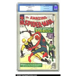 The Amazing Spider-Man #16 (Marvel, 1964) CGC NM 9.4 Off-white to white pages. This super high-grade copy is a classic in every way. It features an awesome cover and the first cross-over appearance of Daredevil. The vibrant colors explode from the stark white background. Considering the success of the first "Spider-Man" movie and the imminent "Daredevil" movie, this issue has great investment potential. This is one of the nicest copies to surface and will make a grand addition to any collection. Overstreet 2002 NM 9.4 value = $600. Important notice: We expect to be auctioning lots at the rate of 200-250 per hour. Sometimes eBay Premier live bid software cannot keep up with that pace, so we strongly recommend that you place a realistic proxy bid now as insurance to avoid disappointment. Also please note that all Heritage/CAA lots purchased through eBay Premier carry a 20% Buyer's Premium. Please make sure you read the Terms and Conditions.