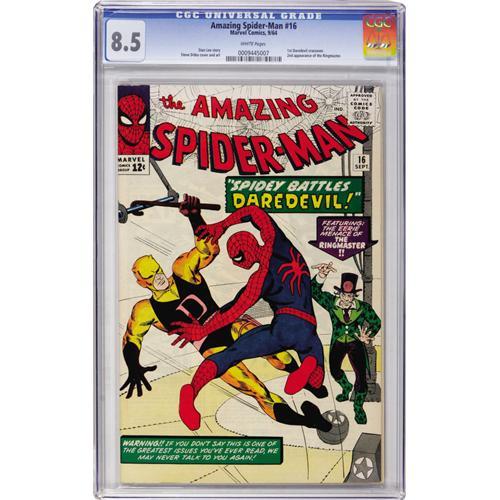 <B>The Amazing Spider-Man #16 (Marvel, 1964) CGC VF+ 8.5 White pages.</B></I> Spidey and Daredevil battle the Ringmaster. It's Daredevil's first crossover, still in his original yellow costume. Steve Ditko cover and art. Overstreet 2006 VF 8.0 value = $519; VF/NM 9.0 value = $872. CGC census 3/07: 32 in 8.5, 71 higher. <I> From the Janowicz Collection.</B></I><BR><BR><b>Shipping:</b> Comics - Slabbed (certified) (<a target="_blank" href="http://www.heritageauctions.com/common/shipping.php">view shipping information</a>)