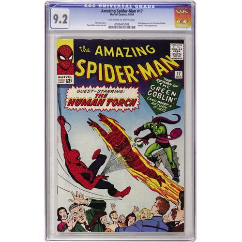 <B>The Amazing Spider-Man #17 (Marvel, 1964) CGC NM- 9.2 Off-white to white pages.</B></I> Green Goblin cover story, his second appearance. Human Torch crossover. Steve Ditko cover and art. Overstreet 2006 NM- 9.2 value = $1,500. CGC census 3/07: 23 in 9.2, 25 higher. <I> From the Janowicz Collection.</B></I><BR><BR><b>Shipping:</b> Comics - Slabbed (certified) (<a target="_blank" href="http://www.heritageauctions.com/common/shipping.php">view shipping information</a>)