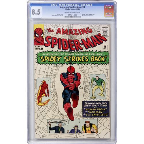 <B>The Amazing Spider-Man #19 (Marvel, 1964) CGC VF+ 8.5 Off-white to white pages.</B></I> The Sandman and the Enforcers are back, and only one man can stop them, that man being.... <I>the Human Torch?</B></I> Luckily Spidey shrugs off his latest crisis to help out. Steve Ditko drew the whole shebang. Overstreet 2006 VF 8.0 value = $308; VF/NM 9.0 value = $504. CGC census 3/07: 47 in 8.5, 108 higher.<BR><BR><b>Shipping:</b> Comics - Slabbed (certified) (<a target="_blank" href="http://www.heritageauctions.com/common/shipping.php">view shipping information</a>)