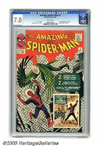 <B>The Amazing Spider-Man #2 (Marvel, 1963) CGC FN/VF 7.0 White pages.</B></I> The Vulture made his first appearance in this issue! From the very start, the bald baddie's favorite trick was to drop Spidey from high altitudes, making the Webhead look around frantically for a life-saving flagpole. Also making his debut here was a second villain, the Terrible Tinkerer. The cover and interior art are by Steve Ditko. Overstreet 2005 FN 6.0 value = $915; VF 8.0 value = $2,790. CGC census 5/05: 17 in 7.0, 68 higher.