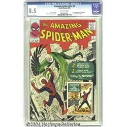 <B>The Amazing Spider-Man #2 (Marvel, 1963) CGC VF+ 8.5 Off-white pages.</B></I> The villainous Vulture sets Spidey's heart aflutter in this Stan Lee/Steve Ditko classic. This beautiful copy of Spidey's second issue is not easy to locate in higher grades. This copy packs no shortage of cover gloss and commands above-average page quality. It's certainly an impressive copy any way you look at it. Overstreet 2004 VF 8.0 value = $2,685; VF/NM 9.0 value = $4,343. <BR><BR><B>Important notice:</B> Heritage usually auctions material at the rate of 200-250 lots per hour. On some occasions eBay Live bid software or the Internet may not be able to keep up with the pace of the auction. We recommend placing a realistic absentee bid now as insurance to avoid disappointment. Occasionally the auctioneer may eliminate or reject an eBay Live bid, and the auctioneer may also reopen a lot after the close of the eBay live bidding (usually because we missed an audience bid), and may reject your bid even if it shows you as the winning bidder. By bidding via eBay Live, you agree that Heritage may award the lot to another bidder at its sole discretion under the circumstances described above or any other reasonable circumstances. Since eBay bids are not shown to us until we open the lot on the floor, we treat those bids just like floor bids. In most cases the floor responds before the eBay bid is presented to us, due to Internet lag time, so for consistency we have made it a policy that floor bids are always considered first over tie eBay live bids. Also please note that all Heritage lots purchased through eBay Live carry a 20% Buyer's Premium. Please make sure you read the Terms and Conditions before you bid. </span></font></tr></table></td></tr></table>