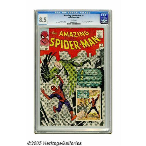 <B>The Amazing Spider-Man #2 (Marvel, 1963) CGC VF+ 8.5 White pages.</B></I> Spidey's second issue features the first appearances of the Vulture and the Terrible Tinkerer. Steve Ditko provided the cover and interior art. Overstreet 2005 VF 8.0 value = $2,790; VF/NM 9.0 value = $4,745. CGC census 9/05: 12 in 8.5, 26 higher. <BR><BR><B>Important notice:</B> Heritage usually auctions material at the rate of 200-250 lots per hour. On some occasions eBay Live bid software or the Internet may not be able to keep up with the pace of the auction. We recommend placing a realistic absentee bid now as insurance to avoid disappointment. Occasionally the auctioneer may eliminate or reject an eBay Live bid, and the auctioneer may also reopen a lot after the close of the eBay live bidding (usually because we missed an audience bid), and may reject your bid even if it shows you as the winning bidder. By bidding via eBay Live, you agree that Heritage may award the lot to another bidder at its sole discretion under the circumstances described above or any other reasonable circumstances. Since eBay bids are not shown to us until we open the lot on the floor, we treat those bids just like floor bids. In most cases the floor responds before the eBay bid is presented to us, due to Internet lag time, so for consistency we have made it a policy that floor bids are always considered first over tie eBay live bids. Also please note that all Heritage lots purchased through eBay Live carry a 20% Buyer's Premium. Please make sure you read the Terms and Conditions before you bid. This lot is being auctioned in conjunction with a live floor auction by Heritage Galleries & Auctioneers. All final auction and invoice information will be supplied by Heritage Galleries & Auctioneers, and all other information should be considered preliminary. Lot:1004 <BR><BR><B>Winning Notification and Billing:</B> After the FINAL session in this auction is complete, Heritage will send e-mail and snail mail invoices.