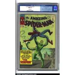 The Amazing Spider-Man #20 (Marvel, 1965) CGC NM- 9.2 Off-white pages. Spider-Man battles that nefarious villain, the Scorpion, for the first time in this issue! Awesome example of the Scorpion's debut drawn by master artist, Steve Ditko. Overstreet 2002 NM 9.4 value = $625. Important notice: We expect to be auctioning lots at the rate of 200-250 per hour. Sometimes eBay Premier live bid software cannot keep up with that pace, so we strongly recommend that you place a realistic proxy bid now as insurance to avoid disappointment. Also please note that all Heritage/CAA lots purchased through eBay Premier carry a 20% Buyer's Premium.