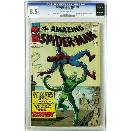 <B>The Amazing Spider-Man #20 (Marvel, 1965) CGC VF+ 8.5 Cream to off-white pages.</B></I> This issue's got the origin and first appearance of the Scorpion, a villain who owed his existence to Spidey's antagonist J. Jonah Jameson. These schemes always seemed to go wrong for Jonah, but that didn't stop the cigar-chomper from trying again and again! Steve Ditko supplied the cover and interior art. Overstreet 2006 VF 8.0 value = $468; VF/NM 9.0 value = $784. CGC census 3/06: 33 in 8.5, 55 higher.