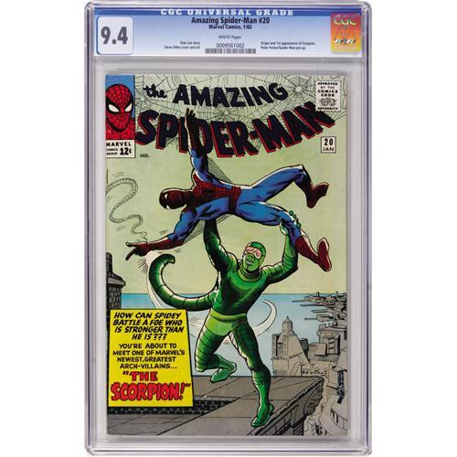 <B>The Amazing Spider-Man #20 (Marvel, 1965) CGC NM 9.4 White pages.</B></I> The Scorpion makes a stinging first impression on our hero. You'll be impressed with how attractive this smooth, supple copy looks, sitting snugly within its CGC holder. Steve Ditko cover and art. Contains a Peter Parker/Spider-Man pin-up. Overstreet 2006 NM- 9.2 value = $1,100. CGC census 3/07: 11 in 9.4, 7 higher. <I> From the Janowicz Collection.</B></I><BR><BR><b>Shipping:</b> Comics - Slabbed (certified) (<a target="_blank" href="http://www.heritageauctions.com/common/shipping.php">view shipping information</a>)