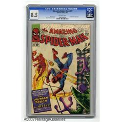 <B>The Amazing Spider-Man #21 (Marvel, 1965) CGC VF+ 8.5 Off-white pages.</B></I> Human Torch crossover. Second appearance of the Beetle. Steve Ditko cover and art. Overstreet 2004 VF 8.0 value = $247; VF/NM 9.0 value = $411. CGC census 12/04: 13 in 8.5, 49 higher.