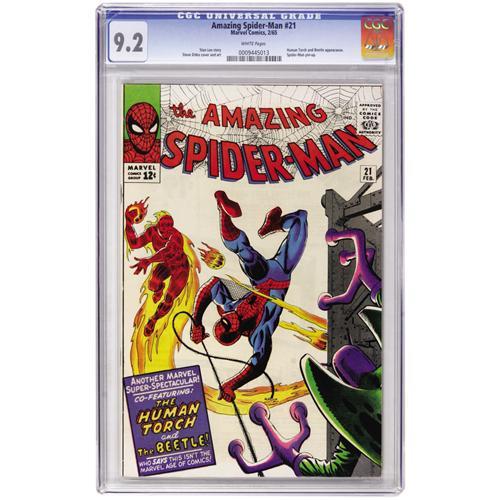 <B>The Amazing Spider-Man #21 (Marvel, 1965) CGC NM- 9.2 White pages.</B></I> Human Torch crossover. Second appearance of the Beetle. Steve Ditko cover and art. Overstreet 2006 NM- 9.2 value = $675. CGC census 3/07: 16 in 9.2, 20 higher. <I> From the Janowicz Collection.</B></I><BR><BR><b>Shipping:</b> Comics - Slabbed (certified) (<a target="_blank" href="http://www.heritageauctions.com/common/shipping.php">view shipping information</a>)