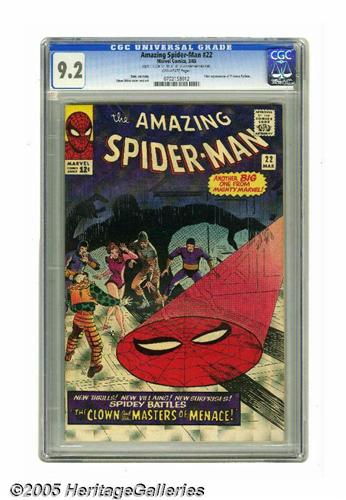 <B>The Amazing Spider-Man #22 (Marvel, 1965) CGC NM- 9.2 Off-white pages.</B></I> The cast of Spidey-villains grows this issue with the first appearance of Princess Python, here teamed with the Clown and his Masters of Menace. Sturdy Steve Ditko ably handles the cover and art chores. This copy really has a lot of eye-appeal, with a colorful, glossy cover and sharply cut edges. Overstreet 2005 NM- 9.2 value = $525. CGC census 6/05: 23 in 9.2, 18 higher. <I>From the collection of Joe and Nadia Mannarino</B></I>.