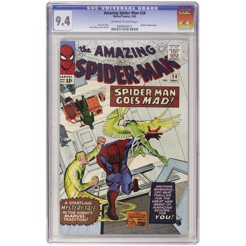 <B>The Amazing Spider-Man #24 (Marvel, 1965) CGC NM 9.4 Off-white to white pages.</B></I> You could go batty looking for a NM copy of this issue that the owner is actually willing to part with -- note the census information below! And speaking of going batty, that's precisely Spider-Man's problem, as portrayed by Steve Ditko. Mysterio is the villain of the issue. Overstreet 2006 NM- 9.2 value = $485. CGC census 3/07: 11 in 9.4, 2 higher. <I> From the Janowicz Collection.</B></I><BR><BR><b>Shipping:</b> Comics - Slabbed (certified) (<a target="_blank" href="http://www.heritageauctions.com/common/shipping.php">view shipping information</a>)