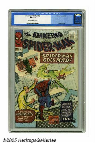 <B>The Amazing Spider-Man #24 (Marvel, 1965) CGC NM- 9.2 Cream to off-white pages.</B></I> Spider-Man thinks he's losing his mind, and he goes to see a psychiatrist! But something about the shrink isn't on the level.... This is just the kind of story that Steve Ditko excelled at, so it's a good thing he was the artist responsible for this issue's cover and interior art. Overstreet 2005 NM- 9.2 value = $475. CGC census 6/05: 17 in 9.2, 11 higher.