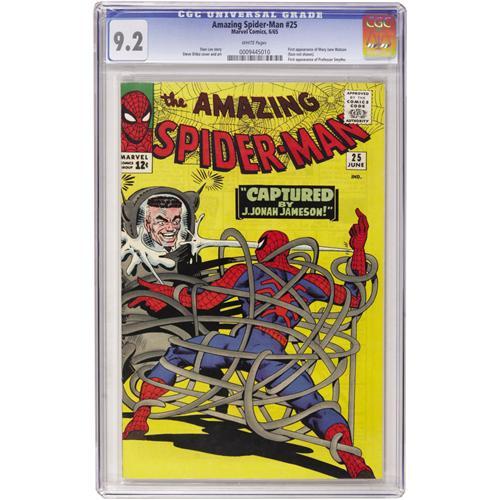 <B>The Amazing Spider-Man #25 (Marvel, 1965) CGC NM- 9.2 White pages.</B></I> This issue had the first appearance of Mary Jane Watson (though the reader couldn't see MJ's fabulous face). It also has the first appearance of Spencer Smythe and his Spider Slayer. Steve Ditko drew the cover and the story. Overstreet 2006 NM- 9.2 value = $575. CGC census 3/07: 28 in 9.2, 17 higher. <I> From the Janowicz Collection.</B></I><BR><BR><b>Shipping:</b> Comics - Slabbed (certified) (<a target="_blank" href="http://www.heritageauctions.com/common/shipping.php">view shipping information</a>)