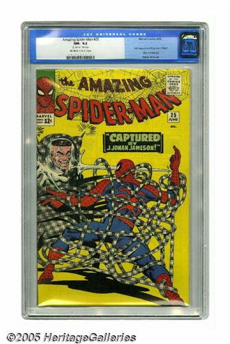 <B>The Amazing Spider-Man #25 (Marvel, 1965) CGC NM- 9.2 Off-white to white pages.</B></I> Mary Jane Watson <I>sort of</B></I> makes her first appearance in this issue. We readers don't see her face, and Peter Parker doesn't see her at all! This issue also has the first appearance of Spencer Smythe and his Spider Slayer robot. The cover and interior art are by Steve Ditko. CGC notes, "1/2-inch tear on 13th page." Overstreet 2005 NM- 9.2 value = $575. CGC census 6/05: 24 in 9.2, 16 higher.