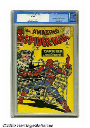 <B>The Amazing Spider-Man #25 (Marvel, 1965) CGC VF 8.0 Cream to off-white pages.</B></I> First appearance of Mary Jane Watson (face not shown). First appearance of Spencer Smythe and his Spider Slayer. Norman Osborn appearance. Steve Ditko cover and art. Overstreet 2005 VF 8.0 value = $270. CGC census 4/05: 31 in 8.0, 85 higher.