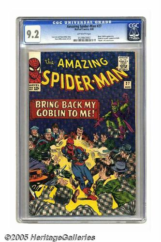 <B>The Amazing Spider-Man #27 (Marvel, 1965) CGC NM- 9.2 Off-white pages.</B></I> While the Green Goblin and the Crime Master battle for control of the city's mobs, Spidey is trying to figure out who those two baddies are, and he's convinced one of them is Frederick Foswell... wrong on both counts, Webhead! It's the fifth appearance overall by the Goblin. The issue's cover and art are by Steve Ditko. Overstreet 2005 NM- 9.2 value = $575. CGC census 6/05: 12 in 9.2, 19 higher.