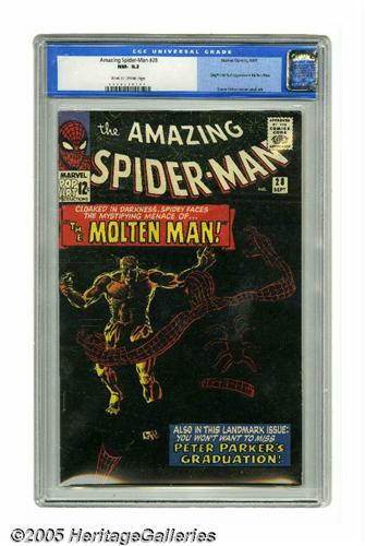<B>The Amazing Spider-Man #28 (Marvel, 1965) CGC NM- 9.2 Off-white to white pages.</B></I> This issue has the reputation of being the toughest of this series to find in high grade, owing to the black cover. CGC's census bears that out; out of nearly 300 slabbed copies, only ten outgrade our offering. The book has the origin and first appearance of the Molten Man, with art by Steve Ditko. Overstreet 2005 NM- 9.2 value = $1,200. CGC census 6/05: 8 in 9.2, 10 higher.