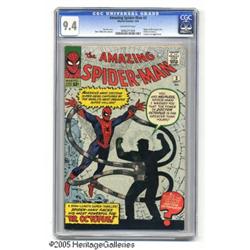 <B>The Amazing Spider-Man #3 (Marvel, 1963) CGC NM 9.4 Off-white pages.</B></I> Doctor Octopus has certainly become a household name in the last year or so. Thanks to "Spider-Man 2," <I>everybody</B></I> knows the guy. And this is the villain's first appearance and origin. There's a first for Spider-Man here as well, as this is the character's first book-length story. Also of note is an appearance by the Human Torch. The story was the work of that team supreme, writer Stan Lee and artist Steve Ditko. There aren't many better specimens of this key book; in fact, a mere two copies have been certified with a higher grade by CGC to date. Overstreet 2004 NM- 9.2 value = $4,200. CGC census 1/05: 6 in 9.4, 2 higher. <I>From the Northern Lights Collection.</B></I>