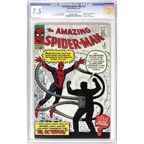 <B>The Amazing Spider-Man #3 (Marvel, 1963) CGC VF- 7.5 Off-white to white pages.</B></I> This is it! The origin and first appearance of Doctor Octopus! All right - we'll concede most of these early issues had a "This is it!" feature, but we're trying to auction a book here! There are other noteworthies - the first full-length story, a Human Torch appearance, a Spider-Man pin-up, Steve Ditko cover and art, and a partridge in a pear tree! Overstreet 2006 VF 8.0 value = $2,109. CGC census 7/06: 21 in 7.5, 76 higher. <BR><BR><B>Important notice:</B> Heritage usually auctions material at the rate of 200-250 lots per hour. On some occasions eBay Live bid software or the Internet may not be able to keep up with the pace of the auction. We recommend placing a realistic absentee bid now as insurance to avoid disappointment. Occasionally the auctioneer may eliminate or reject an eBay Live bid, and the auctioneer may also reopen a lot after the close of the eBay live bidding (usually because we missed an audience bid), and may reject your bid even if it shows you as the winning bidder. By bidding via eBay Live, you agree that Heritage may award the lot to another bidder at its sole discretion under the circumstances described above or any other reasonable circumstances. Since eBay bids are not shown to us until we open the lot on the floor, we treat those bids just like floor bids. In most cases the floor responds before the eBay bid is presented to us, due to Internet lag time, so for consistency we have made it a policy that floor bids are always considered first over tie eBay live bids. Also please note that all Heritage lots purchased through eBay Live carry a 22.5% Buyer's Premium. Please make sure you read the Terms and Conditions before you bid. This lot is being auctioned in conjunction with a live floor auction by Heritage Auction Galleries. All final auction and invoice information will be supplied by Heritage Auction Galleries, and all other information should be considered preliminary. Lot:41001 <BR><BR><B>Winning Notification and Billing:</B> After the FINAL session in this auction is complete, Heritage will send e-mail and snail mail invoices. This process normally takes several days. All final auction and invoice information will be supplied by Heritage Auction Galleries, and all other information should be considered preliminary. <BR><BR>This auction will be conducted on a live auction floor and over the Internet through eBay Live. If you choose to place an absentee bid, please take a moment to <font color='#0000ff'><u><a href='http://pages.ebay.com/liveauctions/help/before/laabsentee.html'>learn how eBay Live absentee bidding works</a></u></font><font color='#000000'>