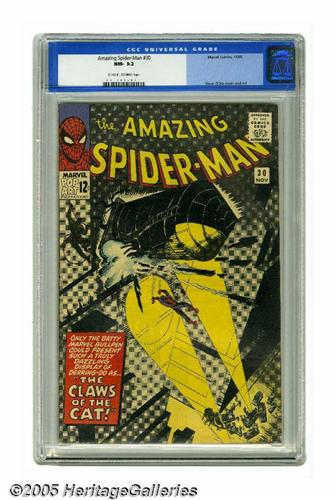 <B>The Amazing Spider-Man #30 (Marvel, 1965) CGC NM- 9.2 Off-white to white pages.</B></I> Only Marvel (and artist Steve Ditko) would be so daring as to publish a cover on which you can barely see the title character! Spider-Man's in a precarious situation here, and Peter Parker's in one as well in the issue, as Betty Brant lets him know that Ned Leeds has popped the question. Overstreet 2005 NM- 9.2 value = $375. CGC census 6/05: 42 in 9.2, 24 higher.