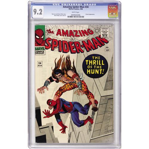 <B>The Amazing Spider-Man #34 (Marvel, 1966) CGC NM- 9.2 White pages.</B></I> Kraven the Hunter revels in "The Thrill of the Hunt!" as he tangles with Spidey in this lively Stan Lee/Steve Ditko outing. The cover's white background is clean and sharp. Overstreet 2006 NM- 9.2 value = $360. CGC census 3/07: 33 in 9.2, 31 higher. <I> From the Janowicz Collection.</B></I><BR><BR><b>Shipping:</b> Comics - Slabbed (certified) (<a target="_blank" href="http://www.heritageauctions.com/common/shipping.php">view shipping information</a>)