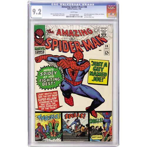 <B>The Amazing Spider-Man #38 (Marvel, 1966) CGC NM- 9.2 White pages.</B></I> Second appearance of Mary Jane Watson (face not shown). Steve Ditko cover and art (his last issue as artist of the title). Overstreet 2006 NM- 9.2 value = $360. CGC census 3/07: 24 in 9.2, 35 higher.<BR><BR><b>Shipping:</b> Comics - Slabbed (certified) (<a target="_blank" href="http://www.heritageauctions.com/common/shipping.php">view shipping information</a>)