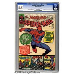 <B>The Amazing Spider-Man #38 (Marvel, 1966) CGC VF+ 8.5 Off-white to white pages.</B></I> Second appearance of Mary Jane Watson (face not shown). Steve Ditko cover and art. Last Ditko issue. Overstreet 2004 VF 8.0 value = $138; NM- 9.2 value = $234. CGC census 12/04: 33 in 8.5, 77 higher.