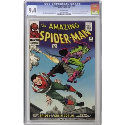 <B>The Amazing Spider-Man #39 (Marvel, 1966) CGC NM 9.4 Off-white pages.</B></I> The Guide price has been left in the dust when you're talking about top-grade copies of this book! And the reason collectors have been paying four figures for 9.4 copies is that this is the first issue of the title with John Romita Sr. art, as well as the ish that reveals Norman Osborn to be the Green Goblin. As of this writing, no copy has exceeded a 9.6 grade in CGC's census. Overstreet 2006 NM- 9.2 value = $550. CGC census 9/06: 22 in 9.4, 14 higher.<BR><BR><b>Shipping:</b> Slabbed Comic (<a target="_blank" href="http://www.heritageauctions.com/common/shipping.php">view shipping information</a>)