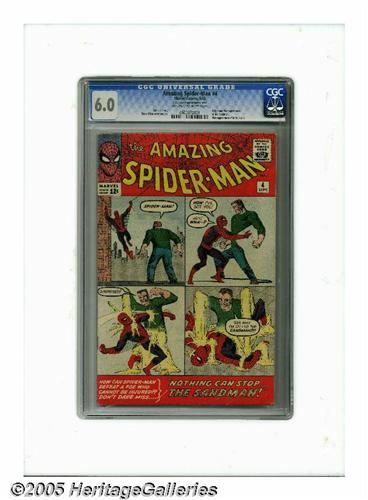 <B>The Amazing Spider-Man #4 (Marvel, 1963) CGC FN 6.0 Off-white to white pages.</B></I> Featured here true believers: The origin and first appearance of Sandman, one of Spidey's most persistent foes, as well as the first appearances of love interest Betty Brant and Liz Allen. There's also Steve Ditko cover and art, too. Overstreet 2005 FN 6.0 value = $570. CGC census 1/05: 15 in 6.0, 122 higher.