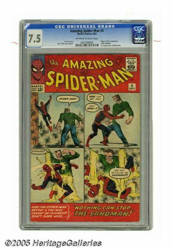 <B>The Amazing Spider-Man #4 (Marvel, 1963) CGC VF- 7.5 Off-white to white pages.</B></I> This power-packed issue features the origin and first appearance of the Sandman, along with the first appearances of both Liz Allen and heart-throb Betty Brant. With cover and interior artwork by Steve Ditko and an attractive CGC-certified grade, we ask "how can you go wrong?" Just take a look at the four-panel cover art and enjoy the nostalgia of early Silver Age Spider-Man. Overstreet 2005 VF 8.0 value = $1,663. CGC census 1/05: 23 in 7.5, 64 higher.