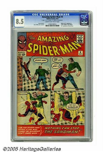 <B>The Amazing Spider-Man #4 (Marvel, 1963) CGC VF+ 8.5 Cream to off-white pages.</B></I> As we finished up this catalog we hadn't yet received confirmation, but rumor has it that the Sandman is going to be the featured villain in the third Spider-Man movie! If that's true, look for a surge of interest in this book, the character's first appearance. This issue also has the first appearances of supporting characters Betty Brant and Liz Allen, both of whom would be love interests for Peter Parker. Steve Ditko supplied his usual superb art inside as well as on the cover. Overstreet 2005 VF 8.0 value = $1,663; VF/NM 9.0 value = $2,732. CGC census 6/05: 16 in 8.5, 34 higher. <I>From the collection of Joe and Nadia Mannarino.</B></I>