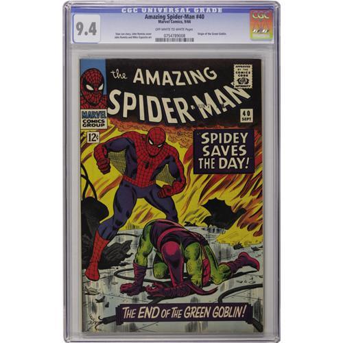 <B>The Amazing Spider-Man #40 (Marvel, 1966) CGC NM 9.4 Off-white to white pages.</B></I> Wow! A single owner copy in 9.4, featuring a Green Goblin cover story plus John Romita Sr.'s second cover and interior art for the title. The Green Goblin's origin is even revealed. Does it ever stop? Don't miss out on this key beauty. Overstreet 2006 NM- 9.2 value = $675. CGC census 9/06: 31 in 9.4, 10 higher. <I>From the Madison Monk Collection.</B></I><BR><BR><b>Shipping:</b> Slabbed Comic (<a target="_blank" href="http://www.heritageauctions.com/common/shipping.php">view shipping information</a>)