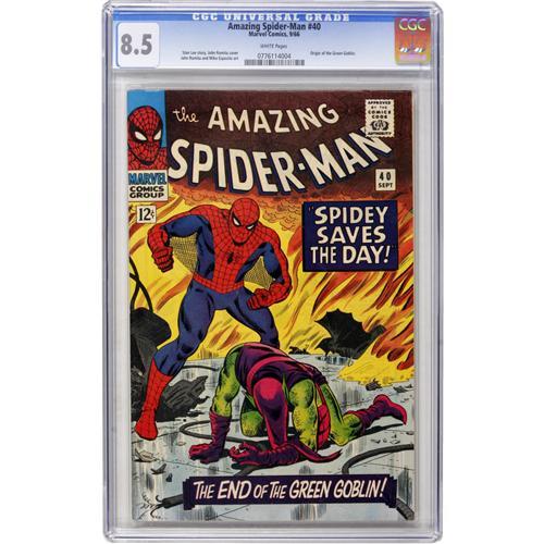 <B>The Amazing Spider-Man #40 (Marvel, 1966) CGC VF+ 8.5 White pages.</B></I> The origin of the Green Goblin is told in just the second issue as penciler for John Romita Sr. Overstreet 2006 VF 8.0 value = $300; VF/NM 9.0 value = $488. CGC census 3/07: 50 in 8.5, 161 higher.<BR><BR><b>Shipping:</b> Comics - Slabbed (certified) (<a target="_blank" href="http://www.heritageauctions.com/common/shipping.php">view shipping information</a>)