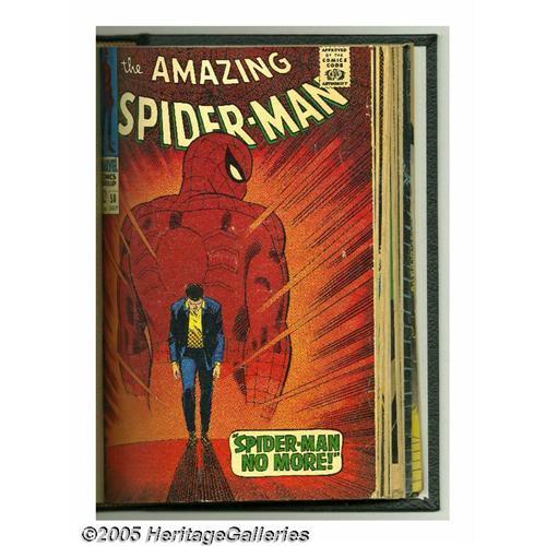<B>The Amazing Spider-Man #41-60 Bound Volume (Marvel, 1966-68).</B></I> The first appearance of the Kingpin and early appearances by Mary Jane Watson -- and of course lots of John Romita Sr. art -- are among the highlights of this part of the run. Note that these copies have not been trimmed prior to binding. Most of these issues were obviously in nice condition (some even VF or better) when bound; the only major defects of note are a water stain on #43 and a chunk missing from the cover of #60. The spine of the book is embossed with the title and issue numbers, and the previous owner's name is embossed on the front of the book. Overstreet 2005 VG 4.0 value for group = $654. <BR><BR><B>Important notice:</B> Heritage usually auctions material at the rate of 200-250 lots per hour. On some occasions eBay Live bid software or the Internet may not be able to keep up with the pace of the auction. We recommend placing a realistic absentee bid now as insurance to avoid disappointment. Occasionally the auctioneer may eliminate or reject an eBay Live bid, and the auctioneer may also reopen a lot after the close of the eBay live bidding (usually because we missed an audience bid), and may reject your bid even if it shows you as the winning bidder. By bidding via eBay Live, you agree that Heritage may award the lot to another bidder at its sole discretion under the circumstances described above or any other reasonable circumstances. Since eBay bids are not shown to us until we open the lot on the floor, we treat those bids just like floor bids. In most cases the floor responds before the eBay bid is presented to us, due to Internet lag time, so for consistency we have made it a policy that floor bids are always considered first over tie eBay live bids. Also please note that all Heritage lots purchased through eBay Live carry a 20% Buyer's Premium. Please make sure you read the Terms and Conditions before you bid. This lot is being auctioned in conjunction with a live floor auc