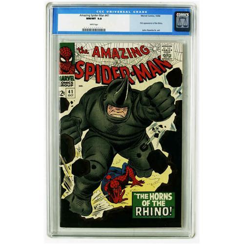 <B>The Amazing Spider-Man #41 (Marvel, 1966) CGC NM/MT 9.8 White pages.</B></I> This copy shares the title of "finest known copy" with just one other according to CGC's census. In one of John Romita Sr.'s earliest issues as penciler of the title, Spidey takes on the Rhino, who makes his first appearance. And meanwhile, Anna Watson promises to introduce Peter Parker to Mary Jane, leading up to the first "real" appearance of MJ in the following issue. Overstreet 2005 NM- 9.2 value = $480. CGC census 12/05: 2 in 9.8, none higher.
