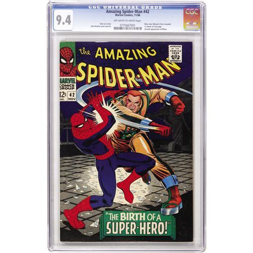 <B>The Amazing Spider-Man #42 (Marvel, 1966) CGC NM 9.4 Off-white to white pages.</B></I> With all respect to John Jameson and the Rhino, what rocked the Spidey fan's world here was one of the most famous comic panels of the 1960s, Mary Jane Watson's first "real" appearance with the sassy line, "Face it, Tiger...you just hit the jackpot!" Or as the <B>Spider-Man Index</B></I> succinctly summarized, "Mary Jane's stunning good looks utterly overwhelm Peter." John Romita Sr. drew the entire issue. Overstreet 2006 NM- 9.2 value = $310. CGC census 3/07: 28 in 9.4, 13 higher.<BR><BR><b>Shipping:</b> Comics - Slabbed (certified) (<a target="_blank" href="http://www.heritageauctions.com/common/shipping.php">view shipping information</a>)