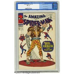 <B>The Amazing Spider-Man #47 (Marvel, 1967) CGC NM 9.4 Off-white pages.</B></I> Flash Thompson's leaving to join the army, and his going-away party is far-out, with Mary Jane Watson and Gwen Stacy shaking their groove things as only artist John Romita Sr. can portray! But who should crash the party but Kraven the Hunter, who's looking for Harry Osborn. As you can imagine, fisticuffs with Spidey ensue. Here's a copy worth fighting over -- despite the white cover it's in beaming NM shape. Overstreet 2004 NM- 9.2 value = $210. CGC census 12/04: 33 in 9.4, 17 higher. <I>From the Northern Lights Collection.</B></I>