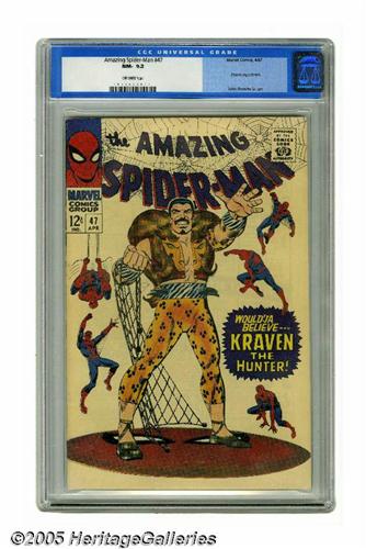 <B>The Amazing Spider-Man #47 (Marvel, 1967) CGC NM- 9.2 Off-white pages.</B></I> Kraven the Hunter appears, as do Harry and Norman Osborn. Green Goblin cameo. John Romita Sr. cover and art. Overstreet 2005 NM- 9.2 value = $220. CGC census 6/05: 44 in 9.2, 54 higher.