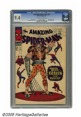 <B>The Amazing Spider-Man #47 (Marvel, 1967) CGC NM 9.4 Off-white to white pages.</B></I> In this issue, Flash Thompson leaves to join the army, but his going-away party is a gas, baby, complete with Mary Jane Watson and Gwen Stacy gettin' down on the dance floor (drawn by John Romita Sr., no less). The gate-crasher is Kraven the Hunter, who wants to put some hurt on Norman Osborn but will settle for Harry Osborn instead. A punch-up with Spidey results. Overstreet 2005 NM- 9.2 value = $220. CGC census 1/05: 34 in 9.4, 17 higher. <I>From the collection of Richard and Wendy Pini.</B></I>