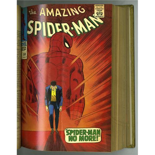 <B>The Amazing Spider-Man #49-64 Bound Volume (Marvel, 1967-68).</B></I> John "Ring-a-Ding" Romita Sr. delivers the artistic thrills in this action-packed bound volume with a gold-colored cover. Inside highlights include appearances by Kraven the Hunter, Kingpin, and of course, plenty of sweet Mary Jane Watson. The comics appear for the most part to have been folded subscription copies; otherwise, the covers look pretty glossy and the interior pages, while tanning slightly along the edges, are still pretty supple. All comics were trimmed during the binding process. Overstreet VG 4.0 value for group = $444.