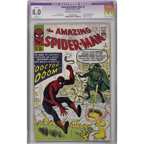 <B>The Amazing Spider-Man #5 (Marvel, 1963) CGC Apparent VF 8.0 Slight (P) Off-white to white pages.</B></I> Doctor Doom's appearance here is his first outside of the <B>Fantastic Four</B></I> book! That means it's the first time he was drawn by someone other than Jack Kirby... no worries mate, Steve Ditko was there to handle the cover and interior art. CGC notes, "Restoration includes: tear seals to cover." Overstreet 2006 GD 2.0 value = $167; VG 4.0 value = $334; FN 6.0 value = $501; VF 8.0 value = $1,461.<BR><BR><b>Shipping:</b> Slabbed Comic (<a target="_blank" href="http://www.heritageauctions.com/common/shipping.php">view shipping information</a>)