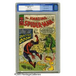 <B>The Amazing Spider-Man #5 (Marvel, 1963) CGC NM+ 9.6 Off-white to white pages.</B></I> In the early run of this title, each issue offered a tougher villain than the one before, and this one has Marvel Comics' number one menace, Doctor Doom, the first time the Latverian was seen anywhere but the pages of <B>Fantastic Four</B></I>. The twist: Von Doom actually wants to recruit Spider-Man for a supervillain team-up, thinking the Webhead is a bad guy! Spidey's having none of it, of course. The Fantastic Four also put in an appearance before all is said and done. While the previous issues had kept the superhero plots and the soap opera stuff largely separate, it all comes together here when Flash Thompson's ill-conceived plan to dress as Spidey leads to capture by Doom (and even more popularity for Flash back at school). On the bright side, this was the story where Peter Parker realizes that Betty Brant really digs him. Somehow, the creative team of Stan Lee and Steve Ditko manage to cram all of that into a 21-page story, no wonder their tenure on this title is the stuff of legend. You won't find a nicer specimen -- no copy has been graded higher by CGC to date. Overstreet 2004 NM- 9.2 value = $2,900. CGC census 12/04: 5 in 9.6, none higher. <I>From the Northern Lights Collection.</B></I>
