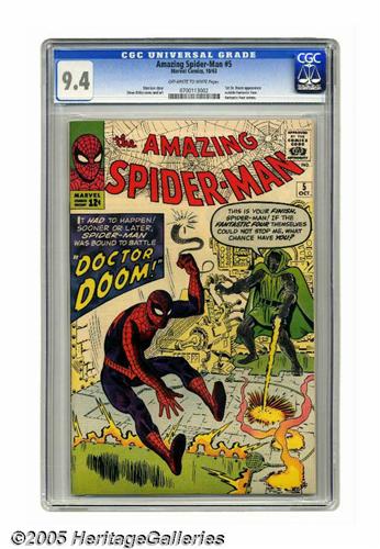 <B>The Amazing Spider-Man #5 (Marvel, 1963) CGC NM 9.4 Off-white to white pages.</B></I> This book's white cover, its significance and of course its grade make it an attractive buy for the Silver Age Marvel collector. It's the first appearance of Doctor Doom outside of <B>The Fantastic Four</B></I> (the FF makes a brief cameo in the issue). In the story, Doom wants Spider-Man to help him battle the FF, but by the end of the issue he's accidentally corralled Flash Thompson, who's hamming it up in a Spidey costume! The cover and interior art are by Steve Ditko. Overstreet 2005 NM- 9.2 value = $3,200. CGC census 4/05: 7 in 9.4, 5 higher.