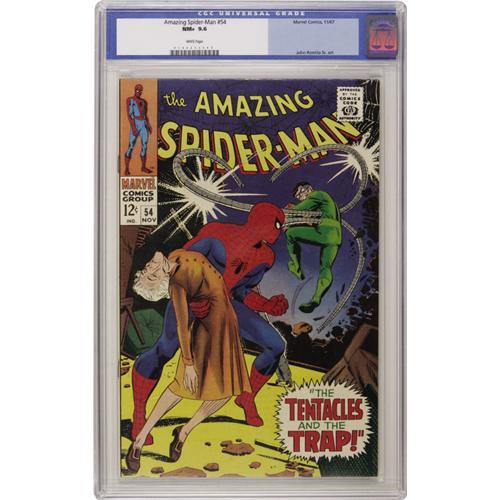 <B>The Amazing Spider-Man #54 (Marvel, 1967) CGC NM+ 9.6 White pages.</B></I> We hadn't seen a copy of #54 with this combination of grade and page quality before! This one's got a John Romita Sr. cover, and inside there's the tale that had many a kid slapping his forehead: Aunt May takes on Otto Octavius as a boarder! Overstreet 2006 NM- 9.2 value = $170. CGC census 10/06: 11 in 9.6, 2 higher.<BR><BR><b>Shipping:</b> Slabbed Comic (<a target="_blank" href="http://www.heritageauctions.com/common/shipping.php">view shipping information</a>)