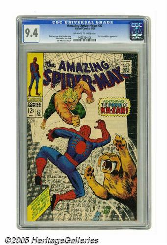 <B>The Amazing Spider-Man #57 (Marvel, 1968) CGC NM 9.4 Off-white to white pages.</B></I> Ka-Zar appearance. John Romita Sr. layouts with Don Heck pencils. Cover by Romita. Overstreet 2005 NM- 9.2 value = $160. CGC census 3/05: 32 in 9.4, 15 higher.