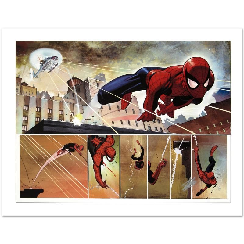 A piece of comic book history, this limited edition, from original art by John Romita Jr., depicts the heroic Iron Man. John Romita Jr. began his career at Marvel UK, doing sketches for covers of reprints. His American debut was with a six-page story entitled "Chaos at the Coffee Bean!" in The Amazing Spider-Man Annual #11 in 1977. His early popularity began with his run on Iron Man in 1978. Since then he has worked on many other comic book series including Thor, Fantastic Four, Daredevil and X-Men. "The Amazing Spider Man #584" is a limited edition numbered giclee on canvas by John Romita Jr. presented by Marvel Comics, hand signed by the Great Stan Lee (1922-2018)! Includes Certificate of Authenticity! Measures approx. 24" x 18" (image).