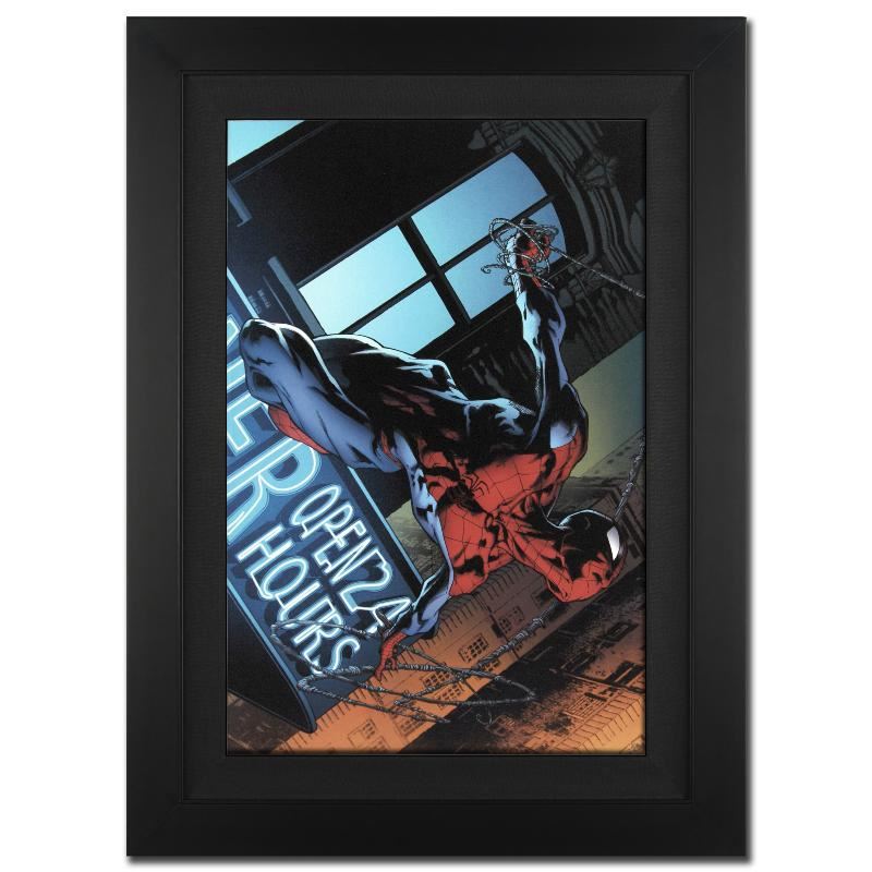 A piece of comic book history, this limited edition, from original art by Joe Quesada, depicts the heroic Spider-Man. Joe Quesada gained renown in the comic book by drawing several Valiant Comics titles. In 1998, Quesada started a series for Marvel called Marvel Knights, the success of which launched him into the editor-in-chief seat and then Chief Creative Officer in 2010. "The Amazing Spider-Man #592" is an extremely limited edition giclee on canvas by Joe Quesada presented by Marvel Comics, hand signed by the great Stan Lee and numbered out of only 4! This piece comes custom framed and ready to hang. Includes Certificate of Authenticity! Measures approx. 29" x 40" (with frame), 22" x 33" (image).