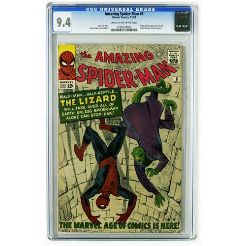 <B>The Amazing Spider-Man #6 (Marvel, 1963) CGC NM 9.4 Cream to off-white pages.</B></I> The Lizard, one of Spider-Man's most memorable foes, made his first of many appearances in this issue. Every Lizard story always had the same wrenching undercurrent: Spidey always had to pull his punches because the villain was really his pal Curt Connors (spelled Conners about half the time)... but the Lizard had no such compunctions about walloping the Webhead! Writer Stan Lee and artist Steve Ditko delivered the action. If you're off to see the Lizard, bring a healthy bidding budget, as this is among the finest copies yet certified of this issue from comics' most-collected title. Overstreet 2005 NM- 9.2 value = $3,000. CGC census 12/05: 9 in 9.4, 6 higher.